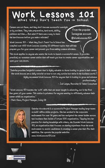 Fortune 500 Project Manager and Career Coach Sabrina Woodworth has compiled over 400 Work Lessons covering 50 topics critical to navigating a successful career. The book covers the full spectrum of career development, from discussing the 'Why' to learning the 'How.'
